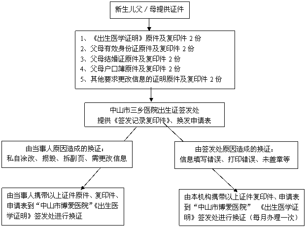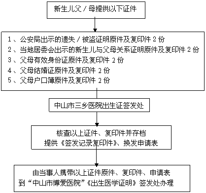 注: 1、中山市三乡医院出生医学证明签发处权限:为本机构内出生的新生儿首次签发《出生医学证明》,无权换/补发《出生医学证明》,中山市博爱医院负责全市换/补发《出生医学证明》工作。 2、中山市三乡医院出生证签发处工作时间:每周两天,分别为星期一和星期四,上午8:00-12:00、下午2:30-5:30,国家法定节假日除外。 3、中山市博爱医院出生医学证明签发处地址:中山市东区城桂路6号博爱医院妇幼保健大楼3楼,工作时间:周一至周五正常上班时间,具体可咨询88776120。 中山市三乡医院 补发《出生医学证明》须知 补发:指因遗失、被盗等等情况造成《出生医学证明》丧失而申请补发。 补发程序:(补发适用于1996年1月1日以后出生的新生儿)