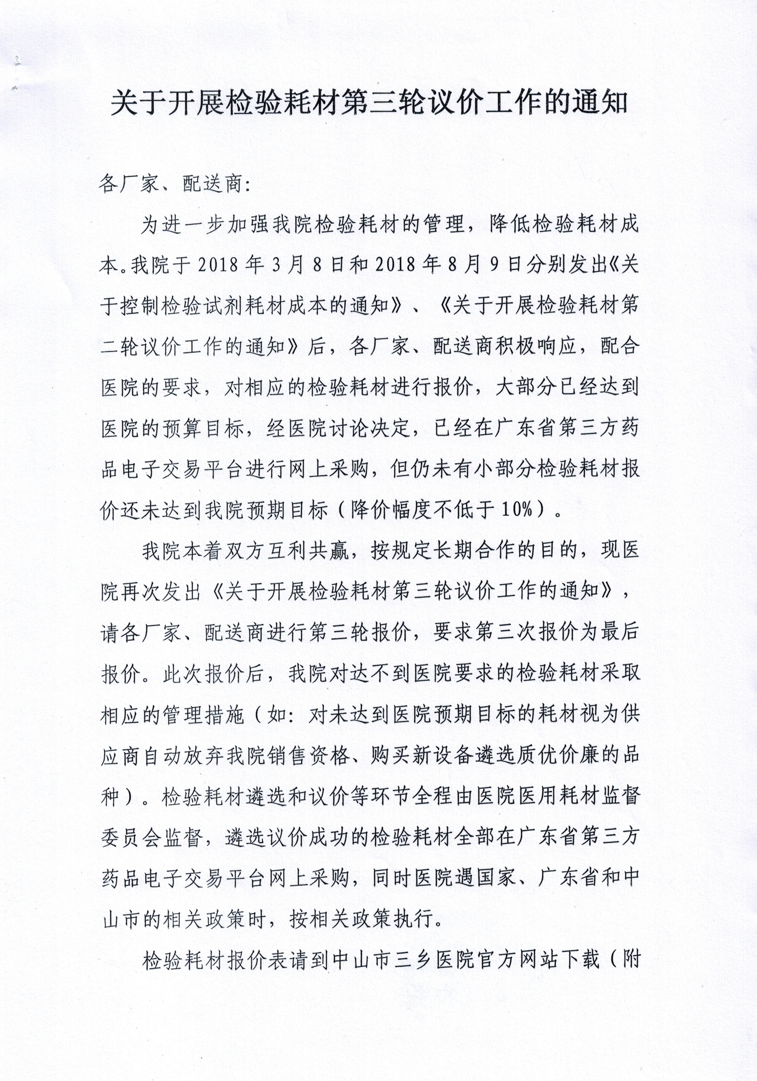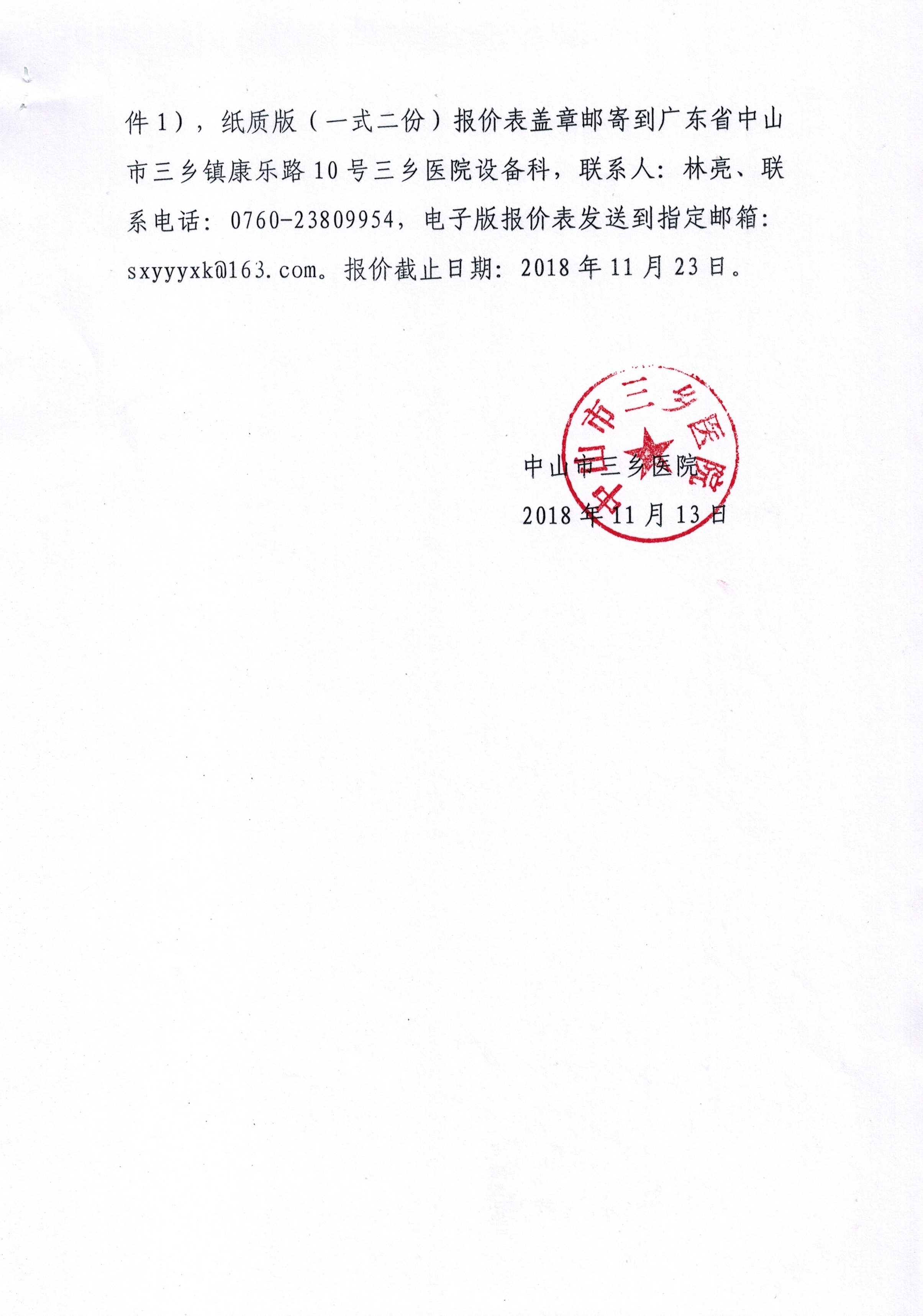 2018年11月份中山市三乡医院院内竞争性磋商采购公告(一)
