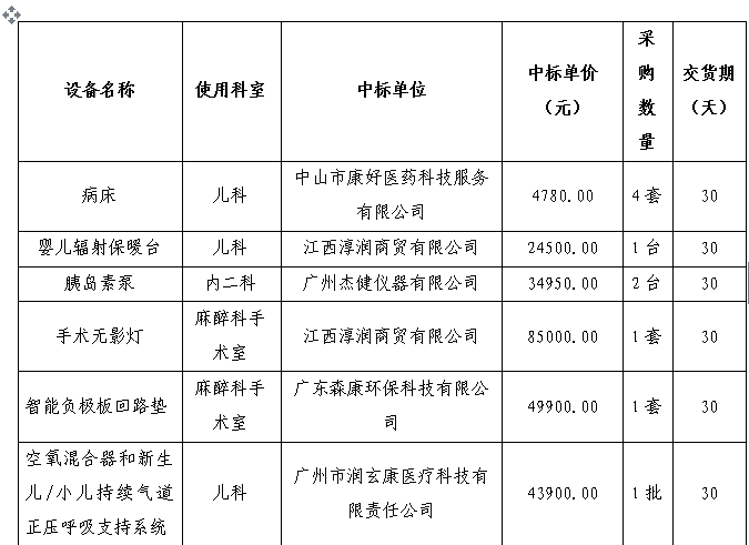 我院于2018年12月7日对病床、空氧混合器和新生儿/小儿持续气道正压呼吸支持系统 、婴儿辐射保暖台、手术无影灯、智能负极板回路垫、胰岛素泵等设备采用院内竞争性磋商进行采购。现就本次采购的中标(成交)结果公告如下: 采购项目名称:病床、空氧混合器和新生儿/小儿持续气道正压呼吸支持系统 、婴儿辐射保暖台、手术无影灯、智能负极板回路垫、胰岛素泵 一、采购方式:院内竞争性磋商采购 三、采购公告日期:2018年11月30日 四、评审信息 1、评审日期:2018年12月7日 2、评审地点:中山市三乡医院六楼大会议室 3、评审委员会成员:蔡小明、吴银宇、郭美凤、黄明生、张志坚 4、监督员:廖伟棠、郑雪芬 五、评审意见: 1、中标(成交)信息
