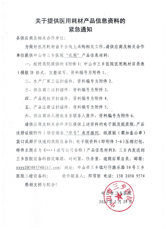 关于提供医用耗材产品信息资料的紧急通知