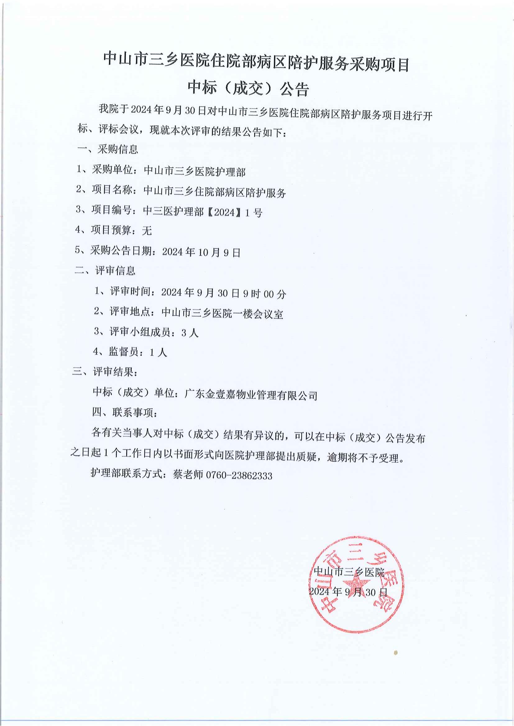 中山市三乡医院住院部病区陪护服务采购项目中标(成交)公告