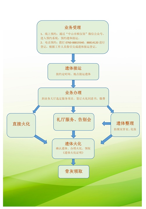 为在院内或院前救治中死亡的病人(含120出车或出诊医生到现场已死亡)办理《居民死亡医学证明(推断)书》(以下简称“死亡证”)或遗体转运时了解注意事项,现制定我院白事一本通,内容如下: 一、办理死亡证申报材料 (一)人口死亡申报单(医院提供)。 (二)死者及申办人有效身份证件的原件及复印件。身份证、户口本、港澳台身份证明、外国人护照等。 (三)死者生前病历、健康体检、居民健康档案等材料(非必须项;非医疗机构内死亡者,尽量提供)。 (四)公安部门证明。如遇死者身份不详、死因疑似涉及刑事案件、接诊医生对家属申报死亡原因判定可疑或难以判断死因性质时,接诊医生或家属应当报警。经调查,若属于正常死亡的或属于非正常死亡但公安鉴定案情不涉及刑事案件,可以由医疗卫生机构的接诊医生根据公安出具的《公安部门涉尸事(案)件调查表》签发死亡证;若属于涉及刑事案件的非正常死亡,由公安签发死亡证。 二、温馨提示 (一)如遇新生儿死亡可提交出生证明或母亲生育证、母亲产检病历就诊资料等佐证材料代替申报材料中第(二)项。 (二)原则上,死亡证由死者家属申请办理,因特殊情况死者家属不能前来的,可由死者家属出具委托代办书,代办人携带死者、死者家属和本人有效身份证件的原件及复印件、委托代办书及“办理死亡证申报材料”申请办理。 (三)如果出现下列情况时,可由死者所属生活机构(养老服务机构、儿童福利机构、救助管理机构等)、工作单位、当地派出所、居(村)委会等出具死者情况说明并指定人员办理死亡证,或参照未知名尸体流程办理死亡证。 1.死者无直系或旁系亲属。 2.死者有直系或旁系亲属,但无法及时取得联系。 3.死者有直系或旁系亲属,但表示不愿为死者办理死亡证。 三、《死亡证》补发 死者家属如遗失死亡证可向原签发单位申请补发一次。家属先联系预防保健办查询是否能查找到《死亡证》旧证或相关记录,如能查找到,持相关材料至医务科申请,填写“补发死亡证申请表”。 四、《死亡证》签发时间 (一)签发时间:8:00-12:00;14:30-17:30 (二)咨询电话:0760-23809987(预防保健办)(上午8:00-12:00;下午14:30-17:30) 非上班时间紧急咨询电话:18666153556 五、遗体的转运 《死亡证》签发之后,由医院医务人员或家属联系中山市殡仪馆。殡仪馆用专用的殡葬车转运遗体,其他任何单位和个人不得转运遗体。(在我院离世的患者,遗体只能运往中山市殡仪馆,如家属有遗体运往外地需求,需在患者遗体运至殡仪馆后再行和殡仪馆沟通转运流程)。 (市殡葬管理中心咨询电话:88806109/88819340、微信号:18124983687、我院投诉电话:23809900市殡葬管理中心监督投诉电话:0760-88384286(市民政局)0760-88818608(市殡仪馆))。 六、办丧业务流程: